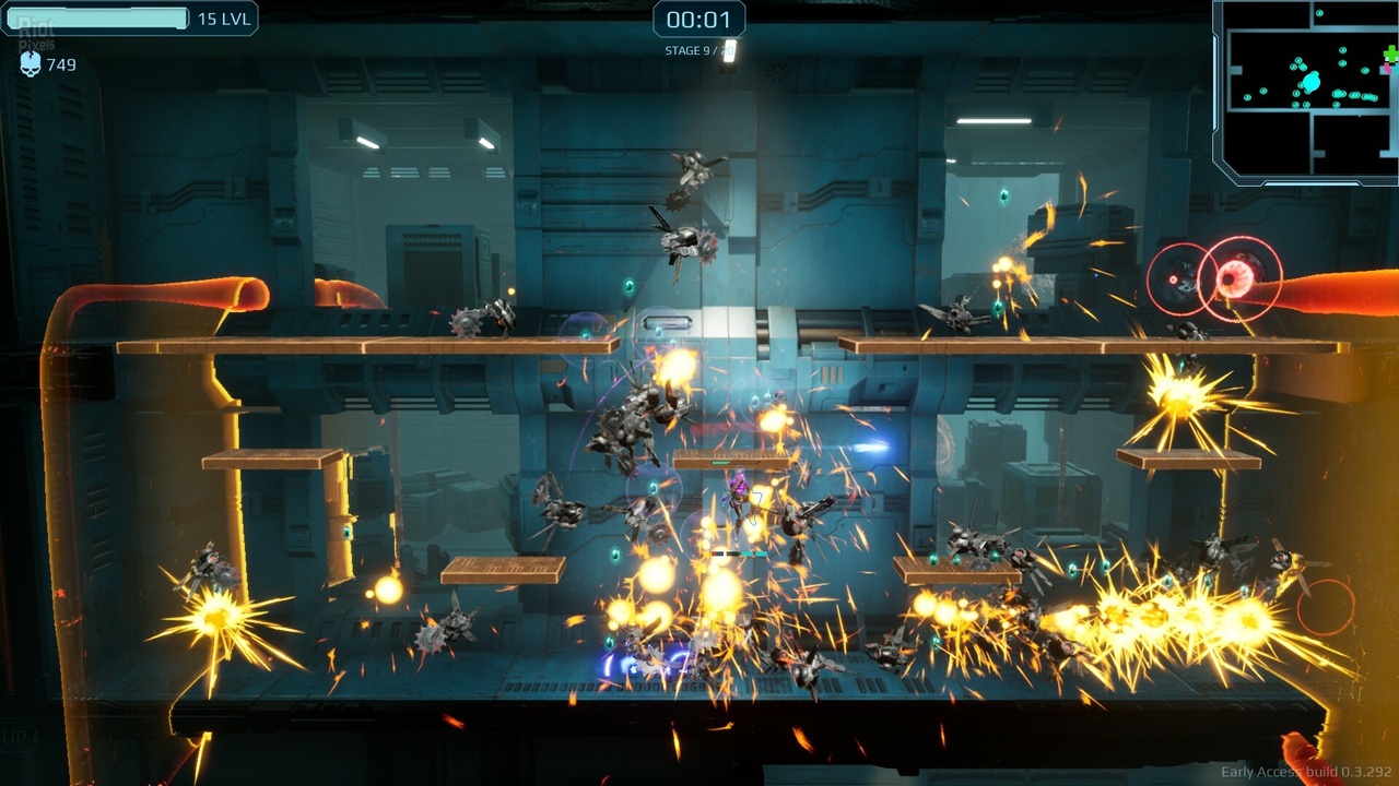 - Сочетание жанров выживания (Bullet Heaven) и платформера.